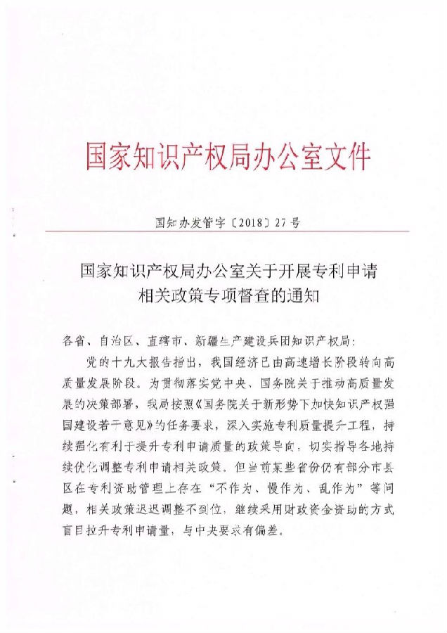 國知局:開展「專利申請相關(guān)政策」專項(xiàng)督查(通知全文)