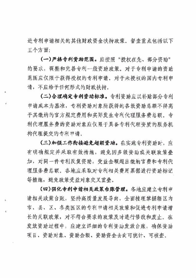 在全面督查各省局指導(dǎo)轄區(qū)內(nèi)各級知識(shí)產(chǎn)權(quán)管理部門落實(shí)《若干意見》基礎(chǔ)上,重點(diǎn)督查專利申請相關(guān)政策的調(diào)整落實(shí)情況,具體是與專利的申請(包括PCT專利申請及其他途徑向國外提交的專利申請)、授權(quán)、擁有和維持等相關(guān)的省、市、縣(區(qū))、園區(qū)各類政策,包含但不限于資助、獎(jiǎng)勵(lì)、補(bǔ)貼及與促進(jìn)專利申請相關(guān)的其他財(cái)政資金扶持政策。督查重點(diǎn)包括以下五個(gè)方面: