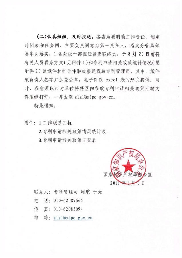 (二)認(rèn)真組織,及時(shí)報(bào)送。各省局要明確工作責(zé)任,制定時(shí)間表和任務(wù)圖,主要負(fù)責(zé)同志為第一責(zé)任人,指定分管局領(lǐng)導(dǎo)牽頭落實(shí),1名處級干部擔(dān)任督查聯(lián)絡(luò)員,于8月20日前將有關(guān)人員聯(lián)系方式(見附件1)和專利申請相關(guān)政策統(tǒng)計(jì)情況(見附件2)以紙件和電子件形式報(bào)送我局專利管理司。其中,紙件須負(fù)責(zé)人簽字并加蓋公章,電子件以 excel表的形式提供。同時(shí),各省須以市為單位將轄區(qū)內(nèi)各級專利申請相關(guān)政策匯編文件壓縮打包,一并發(fā)至z1 zas ipo.gov.cn。