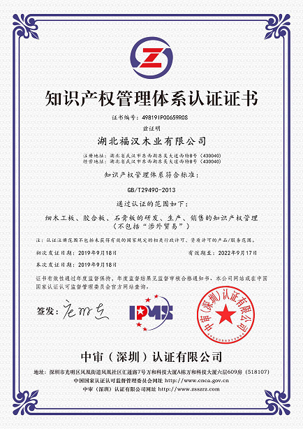 熱烈祝賀湖北福漢木業(yè)有限公司于2019年9月獲得知識產(chǎn)權(quán)貫標認證證書,這意味著湖北福漢木業(yè)在知識產(chǎn)權(quán)領(lǐng)域獲得到重要認可,在知識產(chǎn)權(quán)方面得到進一步規(guī)范和在綜合競爭力得到進一步提升。